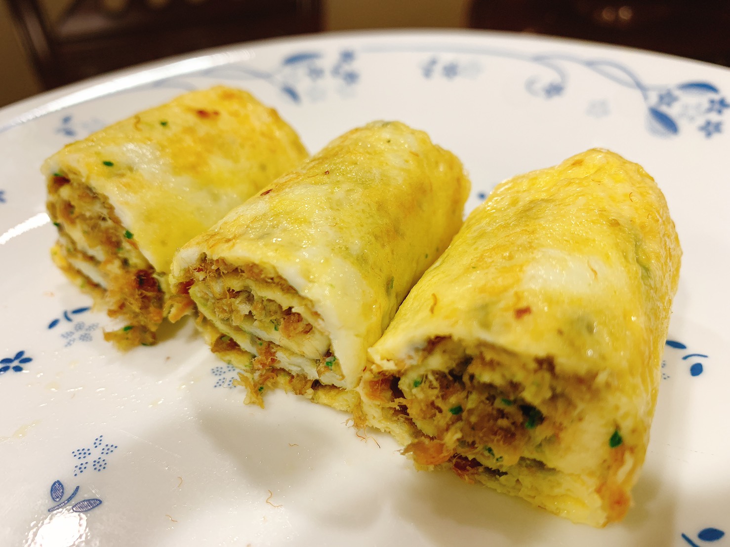 寶寶肉鬆蛋捲 - 蛋捲:一顆蛋加上15cc牛奶打勻,打散的蛋液先入平底鍋,煎到半熟後,撒上肉鬆或紅蘿蔔細絲(紅蘿蔔要刨刀刨成細絲),然後趁蛋還未全熟捲起來定型,全熟後切段。