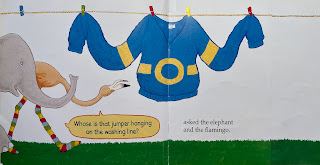 小孩剛開始接觸英文時我很喜歡找Jez Alborough的書給孩子看,從啟蒙階機乎像無字書的單字繪本書hug,Yes,Play,Tall到一階的A Flip-flap book Hide and Seek和A flip-flap book: Washing Line都像專門設計給幼兒學英文的教材一樣,用最簡單的句型,反覆出現,變化出有趣又符合幼兒邏輯的劇情。要很簡單又很有趣真的不容易。這次故事的開始就從一條曬衣繩開始,沿著曬衣繩,看看上面晾了什麼衣物,然後又是誰的呢?翻翻頁的設計讓小朋友根據衣物的特色猜猜看,有趣的故事情節,帶出一樣又一樣的衣物和動物,字彙就跟著故事發展漸漸地堆疊累積。